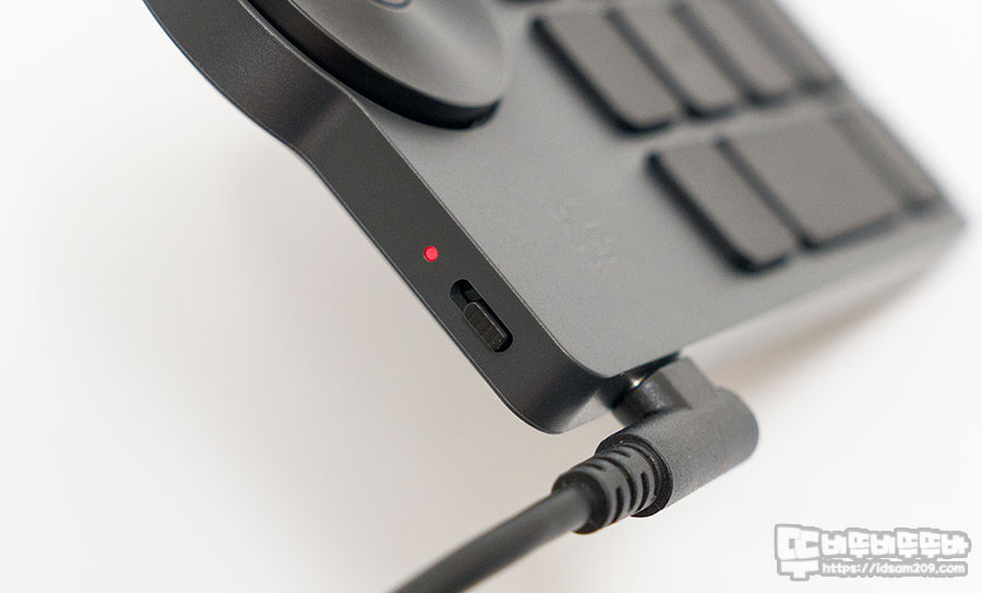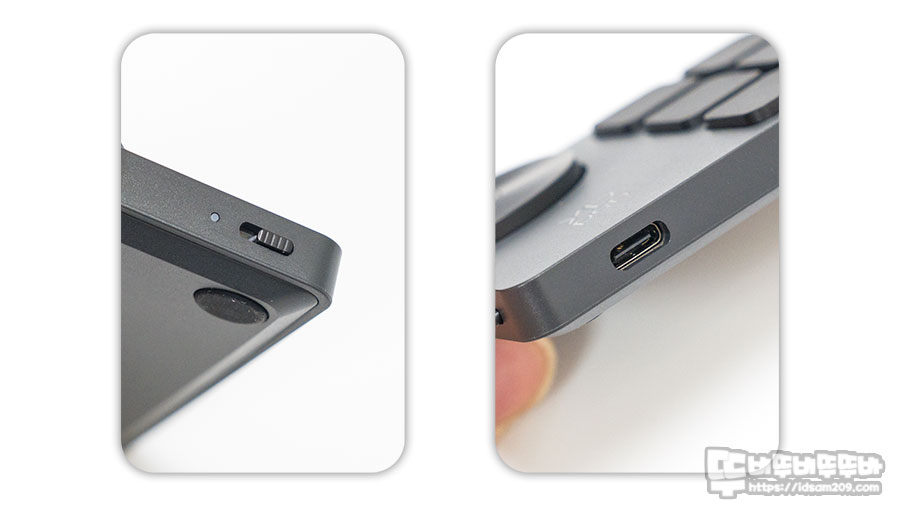 휠 스크롤 아래에는 위로 당겨서 작동하는 틸트 방식의 전원/페어링 스위치 그리고 충전 및 유선 연결을 담당하는 USB-C 단자 모습을 확인할 수 있습니다.