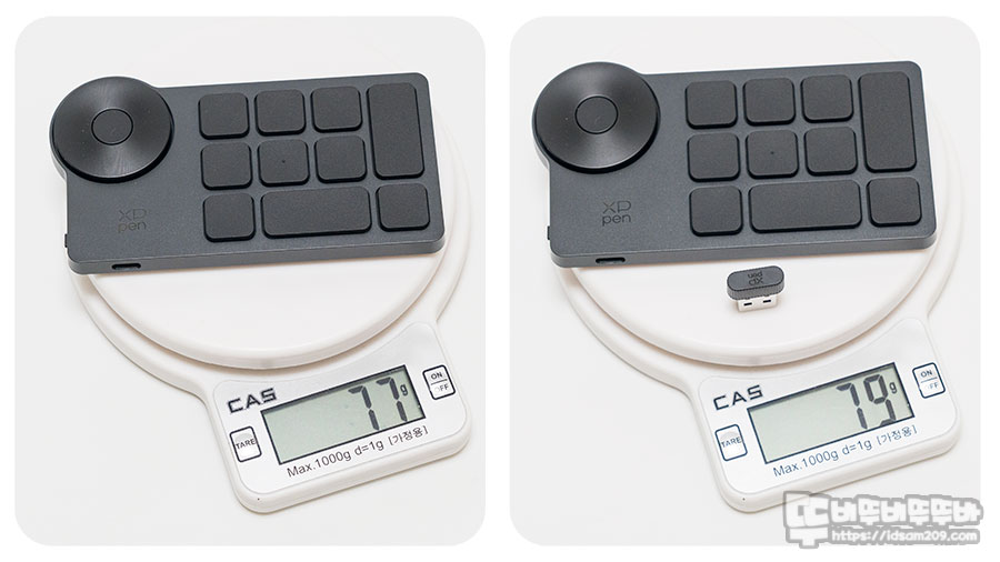 엑스피펜 XP-Pen ACK05 무선 타블렛 키보드 본체 무게를 측정해 보면 약 77g, 무선 리시버 추가 시 약 79g으로 어떤 방식으로 휴대하더라도 부담이 없지만 사이즈가 작은 만큼 분실에 주의하시기 바랍니다.