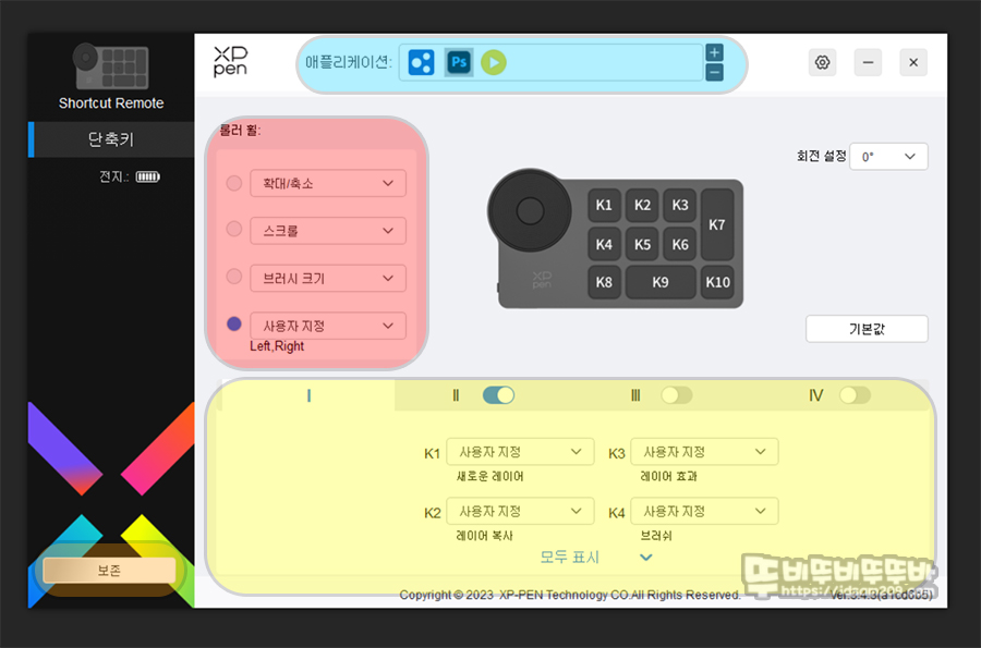 엑스피펜 XP-Pen ACK05 무선 타블렛 키보드 소프트웨어 레이아웃 모습입니다.