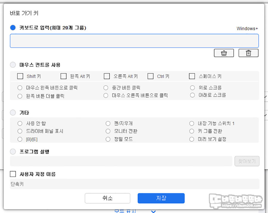 각 버튼을 선택하여 사용자 지정을 선택하면 위와 같이 키보드를 이용한 단축키를 입력하는 메뉴, 마우스 사용 메뉴, 기타로 표현되는 XP-Pen ACK05 기본메뉴, 프로그램 연결 메뉴, 위의 기능을 선택했을 때 "미리 보기" 기능을 활용 시 나타나는 이름 정의 등 대체적으로 직관적으로 편하게 설정할 수 있게 구성되어 있습니다.