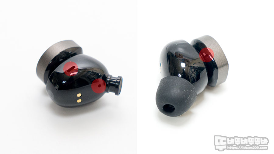 좌우가 대칭으로 디자인된 무선 이어버드는 왼쪽(L), 오른쪽(R)로 구분하고 있으며 버튼 방식으로 조작되는 컨트롤 부분이 건메탈 컬러로 구분하고 있는 게 특징입니다.