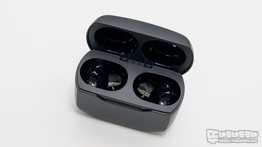 충전 케이스 뚜껑을 열어보면 무선 이어버드가 수납되는 크레들 형태의 디자인 그리고 수납과 충전이 가능한 금속핀을 확인할 수 있습니다.