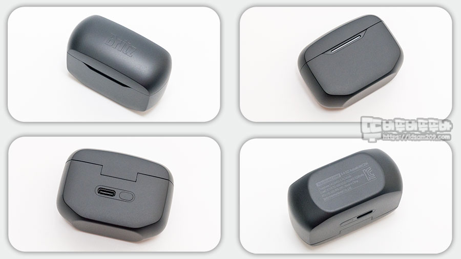 브리츠 Acoustic ANC20HB 블루투스 이어폰의 충전 케이스는 슬림한 형태로 전면에는 배터리 상태를 알려주는 LED 인디케이터, 뒷면에는 USB-C 충전단자 및 페어링 버튼으로 구성되어 있습니다.