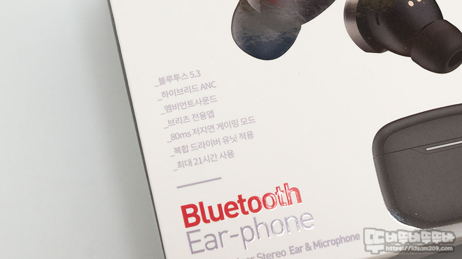 블루투스 버전 5.3, 하이브리드 ANC, 엠비언트 사운드 (주변소음 듣기), 브리츠 전용앱 지원, 80ms 저지연 게이밍 모드 지원, 복합 트라이버 유닛 적용, 최대 21시간 사용 등의 정보를 강조하고 있네요.