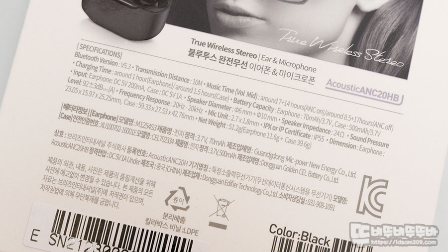 블루투스 버전 5.3, 10mm + 6mm 듀얼 드라이버 사용, IP55 방수지원, 배터리 용량 케이스(500mAh) / 이어버드 (70mAh), 사용시간 : 노이즈캔슬링 On 이어버드 7시간 (충전 케이스 재충전 포함 시 약 21 시간)