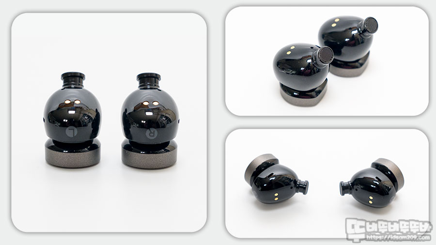 좌우가 대칭으로 디자인된 무선 이어버드는 왼쪽(L), 오른쪽(R)로 구분하고 있으며 버튼 방식으로 조작되는 컨트롤 부분이 건메탈 컬러로 구분하고 있는 게 특징입니다.