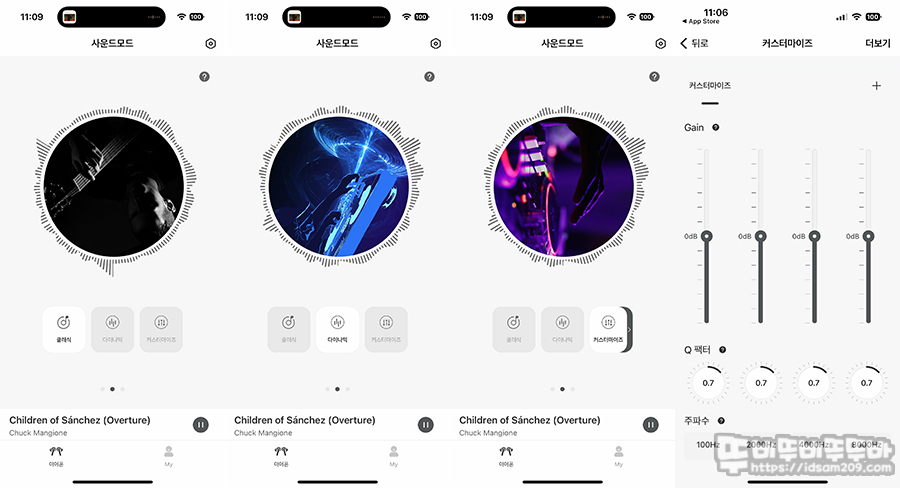 두 번째 메뉴인 사운드 모드에서는 기본값으로 저장된 클래식, 다이나믹 그리고 사용자가 설정할 수 있는 커스터마이즈 메뉴로 직관적으로 사용할 수 있었습니다.