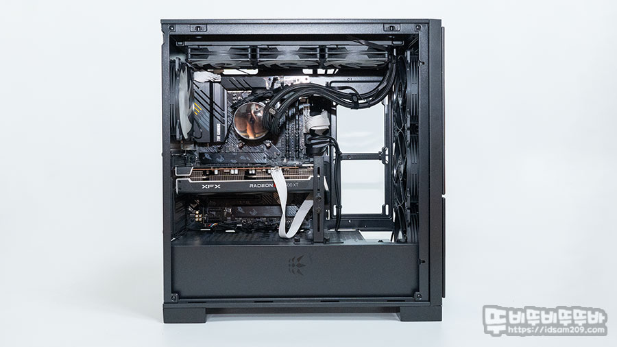 케이스를 리뷰하는 시점에 아이가 쓸 컴퓨터를 조립해야 하는 상황이 되어 리뷰용으로 사용하는 스페어 제품을 모아 모아 EH1-몬드리안 케이스에 조립을 하였는데 ATX 메인보드인 ASUS TUF Gaming B550-PRO를 먼저 조립하고 상단의 3열 수랭 쿨러를 장착하는 과정에서 간섭이 없었고요.