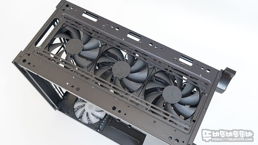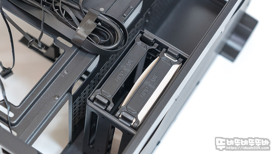 샤시 면에 타공으로 처리된 부분은 쿨링팬이나 일체형 수랭 쿨러를 장착할 수 있는 공간, 뒤쪽으로는 SSD 장착 가이드 2개 그리고 바닥면에는 앞뒤로 이동이 가능한 HDD/SSD 가이드 모습을 확인할 수 있습니다.