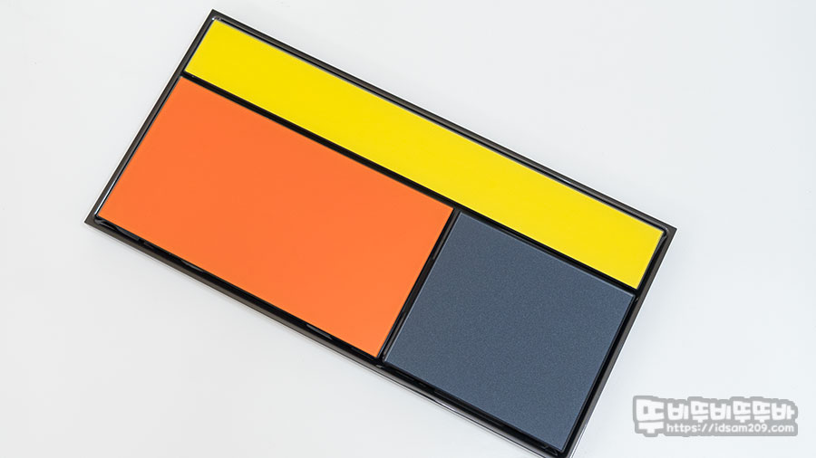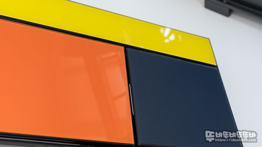3가지 유리를 사용하여 3가지 면을 구성하고 있는 전면 패널을 오렌지와 옐로우 부분은 유광, 블루 부분을 무광으로 사용하여 차별화를 주고 있는데 컬러로 구성된 패널은 뒤쪽에서 나사로 고정하는 형태로 제품 상세 설명의 내용과 같이 9가지 컬러를 조합하여 27가지 구성으로 커스터마이징이 가능합니다.