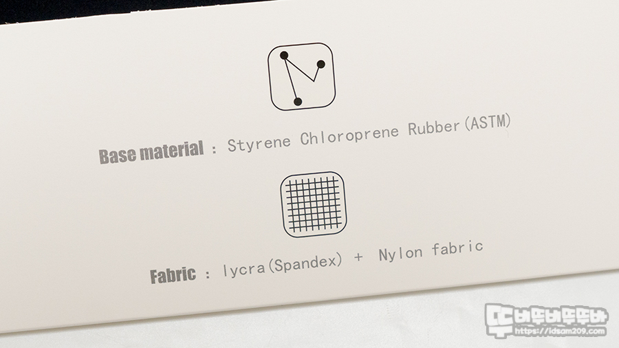 패키지 안쪽에 인쇄된 내용에서는 Styrene Chloroprene Rubber (SCR) 베이스와 라이크라+나일론 패브릭 표면에 대한 정보가 인쇄되어 있는데요.