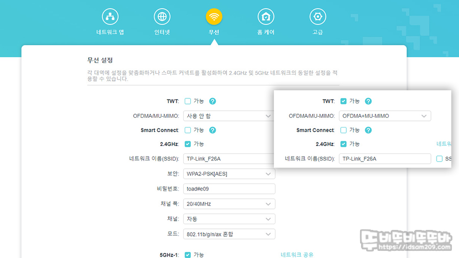 많은 무선 기기를 연결해도 동시에 빠르게 사용 가능 OFDMA/MU-MIMO 기능 등 Wi-Fi 6E을 제대로 사용하기 위해서는 무선 메뉴에 필요한 기능을 찾아서 활성화해주시기 바랍니다.