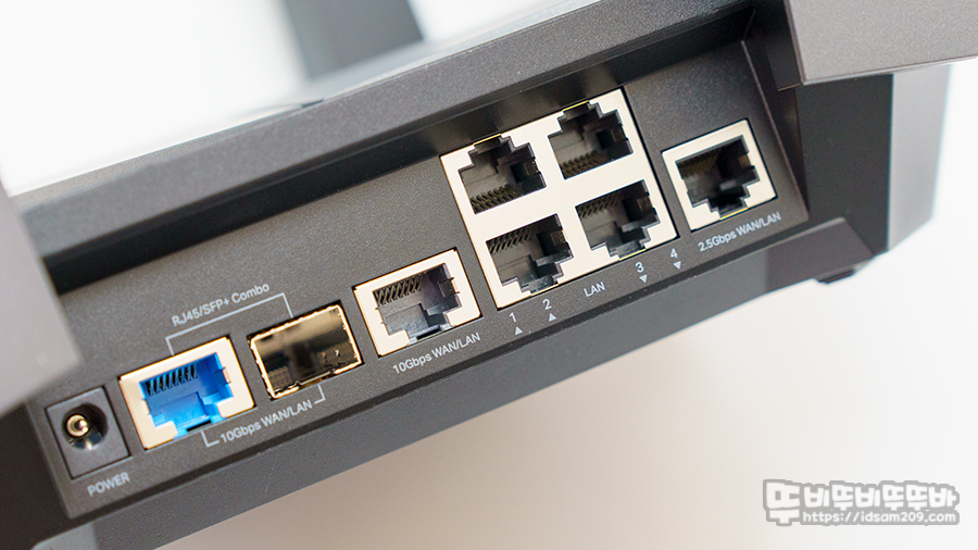 10Gbps 듀얼 포트, 2.5Gbps 포트, 기가비트 LAN포트, USB 3.0 포트 지원 특히 RJ45 포트와 SFP+ 콤보 포트 구성은 지금까지 경험해 보지 못한 넘사벽 공유기 느낌을 경험하게 해 주었습니다.