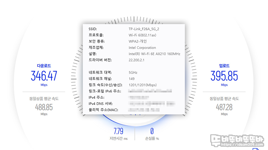 Wi-Fi 6E의 강점이라 할 수 있는 6GHz 무선으로 연결하여 테스트 시 기존에 2.4GHz, 5GHz 속도보다 빠른 다운로드 속도를 보여주는데 연결 상세 내역의 링크 속도만 보더라고 6GHz 끼리 연결 시 수신/발신 속도가 상당히 높은 것 확인할 수 있습니다.