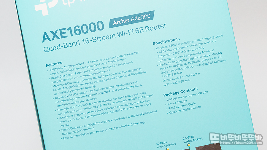 패키지에는 "포브스 선정 ‘2021 고객 신뢰도 1위", 3년 무상보증 그리고 AXE1600 속도, WiFi 6E 지원 등 포인트 정보를 확 할 수 있으며 눈에 띄는 부분은 울트라 하이 16Gbps, Wi-Fi 속도, 듀얼 10G 포트, Wi-Fi 6E 6GHz 주파수 지원, 그리고 2GHz 쿼드코어 프로세서 사용이 강조되고 있습니다.