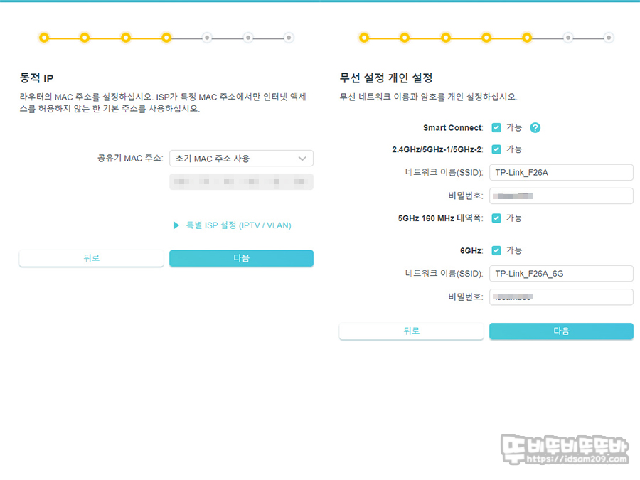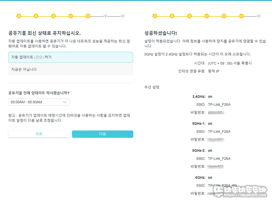 공유기 연결 후 웹브라우저를 실행하면 관리자 비밀번호를 새롭게 설정하게 되며 그다음에는 국가 시간 선택 그리고 화면에 나오는 내용을 천천히 따라가면서 선택해 주세요.