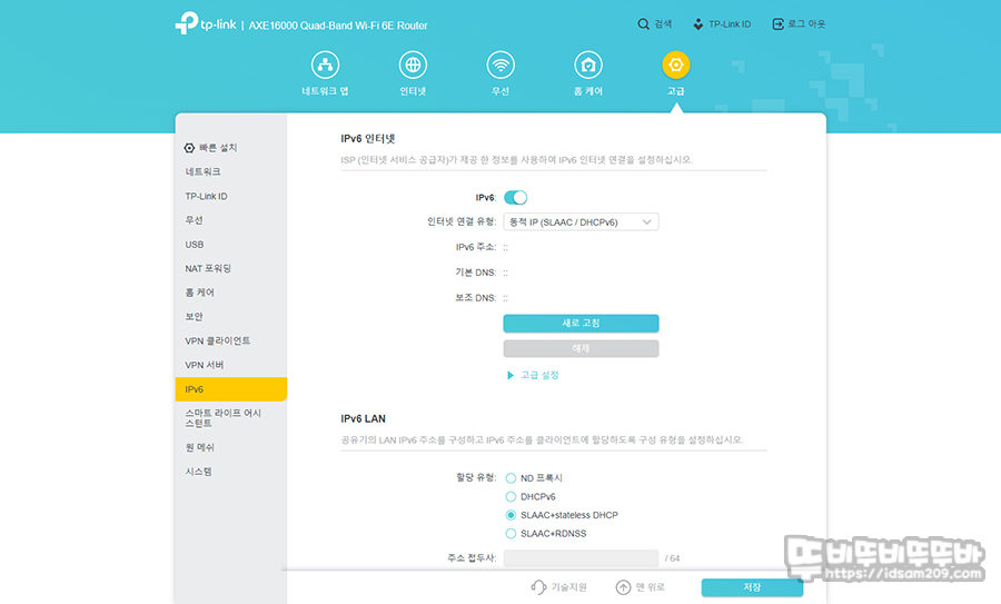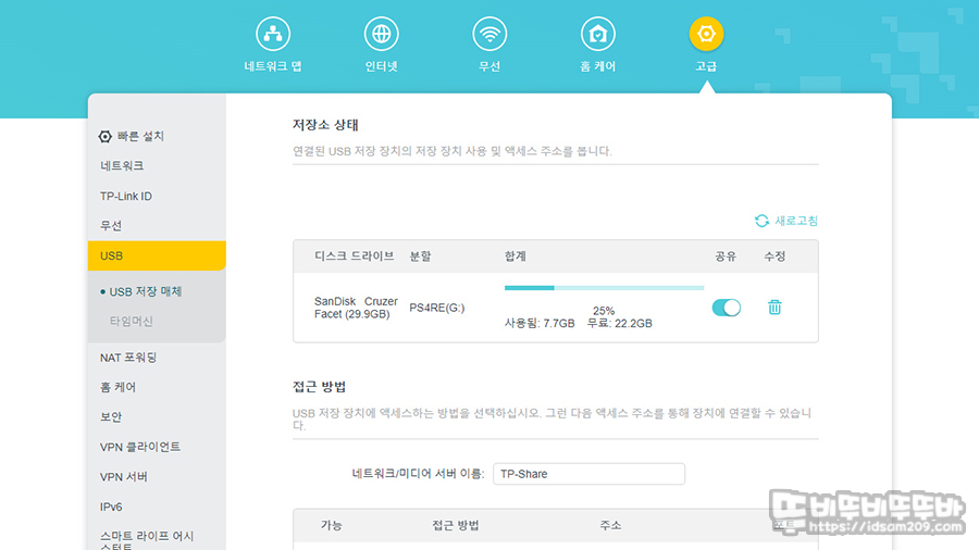 고급 메뉴에서는 USB 3.0 포트에 메모리를 연결했을 때 사용 가능한 간이 NAS 지원과 VPN 서버, IP6v를 메뉴를 통해 On/Off 할 수 있으니 인터넷 통신망에서 지원 여부에 따라 IP6v를 활용하시기 바랍니다.