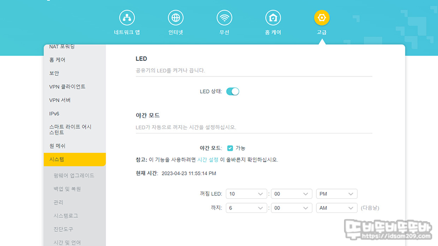고급 - 시스템 메뉴에서는 LED 인디케이터 점등을 제어하는 기능을 제공하여 단순 On/Off, 지정시간 동안 LED Off 하는 기능이 가능하니 수면 시 빛 공해에 민감하신 분들은 잘 활용하시면 좋을 거 같네요.
