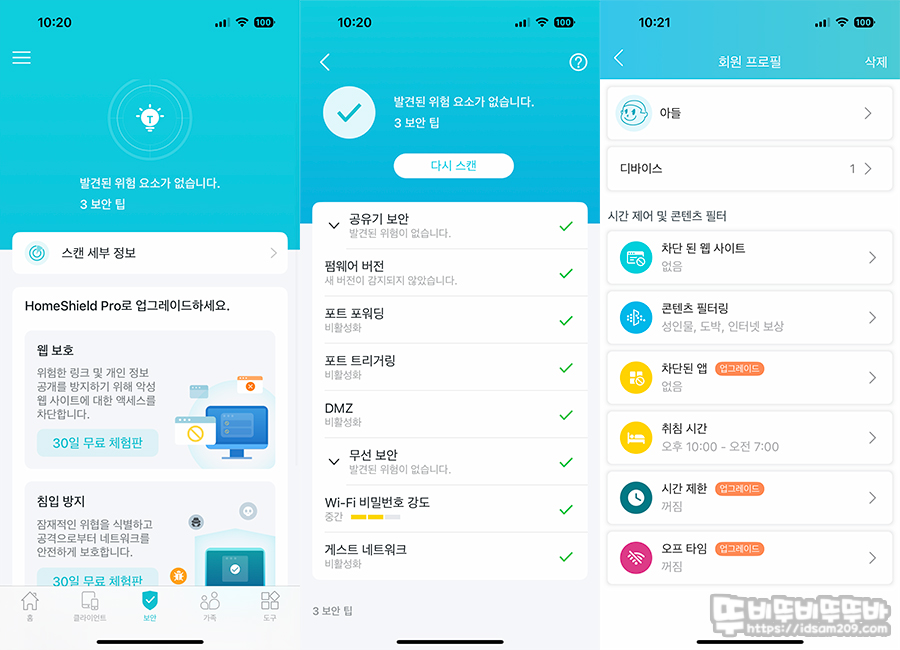 개인적으로 보안 스캔 기능과 자녀 설정 메뉴는 Tether 전용 앱의 구성이 보기 편하더라고요.