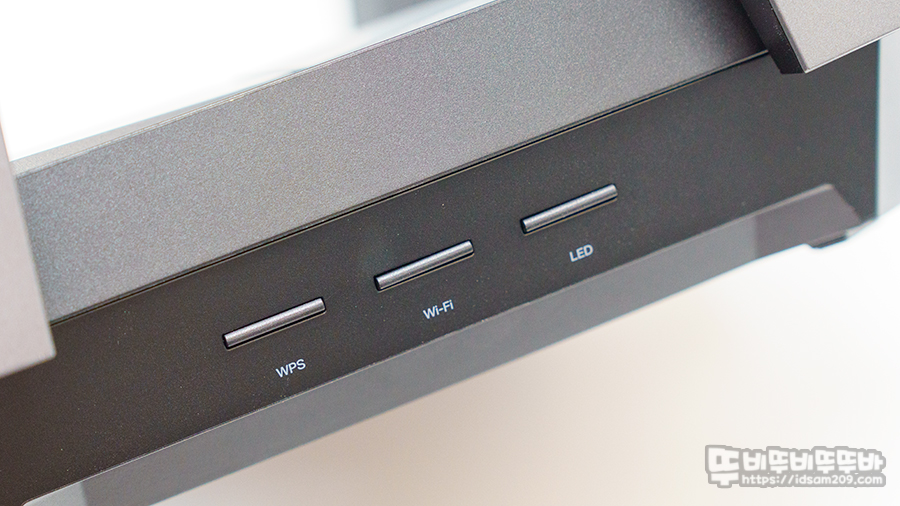 정면에는 WPS, Wi-Fi On/Off, LED On/Off 버튼 그리고 측면에는 전원 버튼과 리셋 버튼, USB 3.0 포트로 구성되어 있고요.