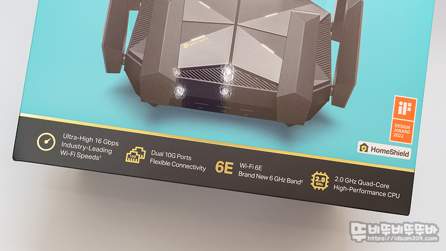 패키지에는 "포브스 선정 ‘2021 고객 신뢰도 1위", 3년 무상보증 그리고 AXE1600 속도, WiFi 6E 지원 등 포인트 정보를 확 할 수 있으며 눈에 띄는 부분은 울트라 하이 16Gbps, Wi-Fi 속도, 듀얼 10G 포트, Wi-Fi 6E 6GHz 주파수 지원, 그리고 2GHz 쿼드코어 프로세서 사용이 강조되고 있습니다.