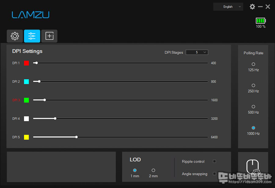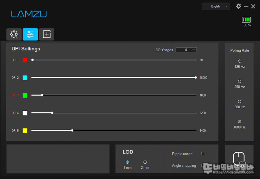 DPI 메뉴에서는 DPI 설정과 LOD 설정, 리플 컨트롤, 앵글 스냅, USB 폴링 레이트 등을 설정할 수 있는데요.