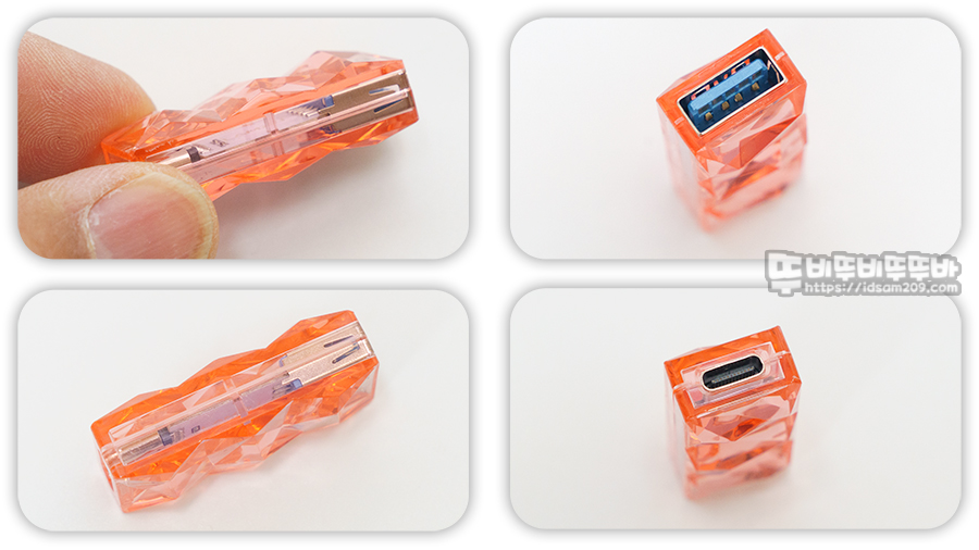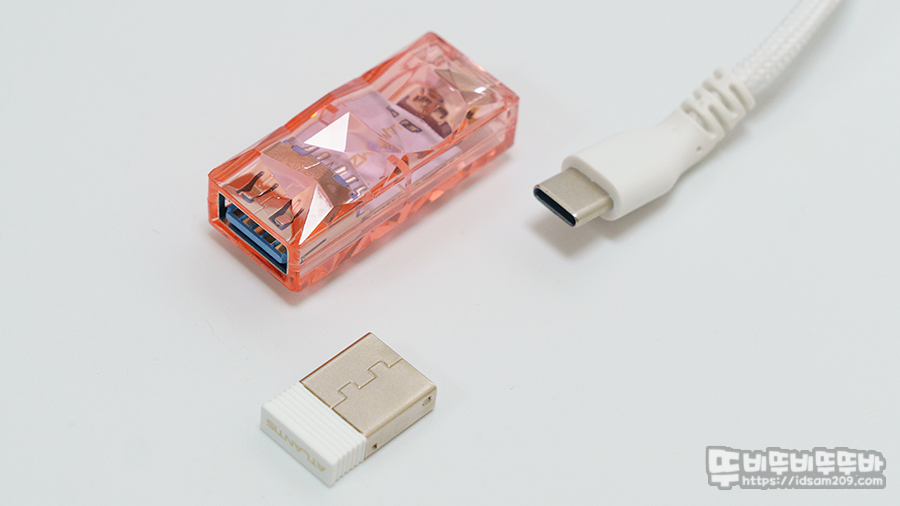 충전 케이블을 무선 리시버와 연결해 주는 연장 아답터는 오리지널의 딱딱한 금속 느낌 대신 클리어 느낌의 플라스틱으로 덮여있어 주얼리 느낌의 신선한 느낌을 줍니다.