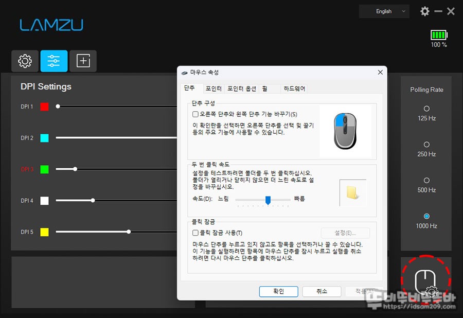 특히 오른쪽 하단에 마우스 아이콘을 클릭하면 윈도우즈 제어판의 마우스 속성 창을 띄워 사용자가 간편하게 조절할 수 있게 해 주네요.