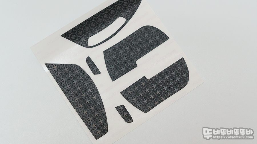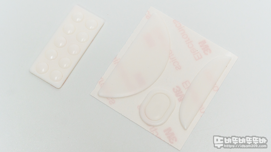마우스 바닥면에 부착된 피트는 과거 MS 익스 마우스 느낌이 나는데 바닥면을 자세히 살펴보면 마우스 앞쪽과 뒤쪽에 넓은 피트를 부착할 수 있게 홈이 있으며 홈 안쪽을 기준으로 작은 사이즈 또는 큰 사이즈 피트를 응용하여 사용할 수 있습니다.