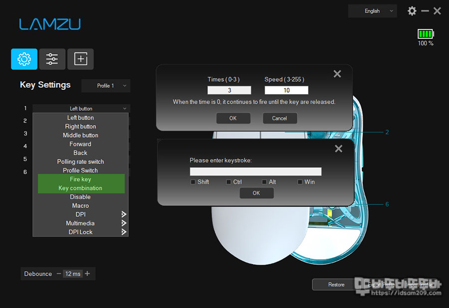 버튼 메뉴에서는 마우스 버튼 기능 이외 파이어 키, 키 콤비네이션 등 게임에 도움이 되는 기능 그리고 매크로, 멀티미디어 등의 버튼 기능과 디바운스 타임을 설정할 수 있습니다.