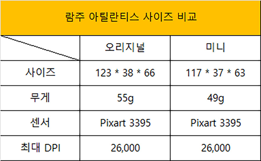 람주 미니는 오리지널과 동일한 픽셀아트의 3395 센서를 사용하고 있으며 크기와 무게를 제외하면 같은 제품이라 할 수 있지만 아무래도 그립감에 영향을 주는 게 전체적인 사이즈가 작은 만큼 차이를 인지하시고 구입하시는 게 좋습니다.