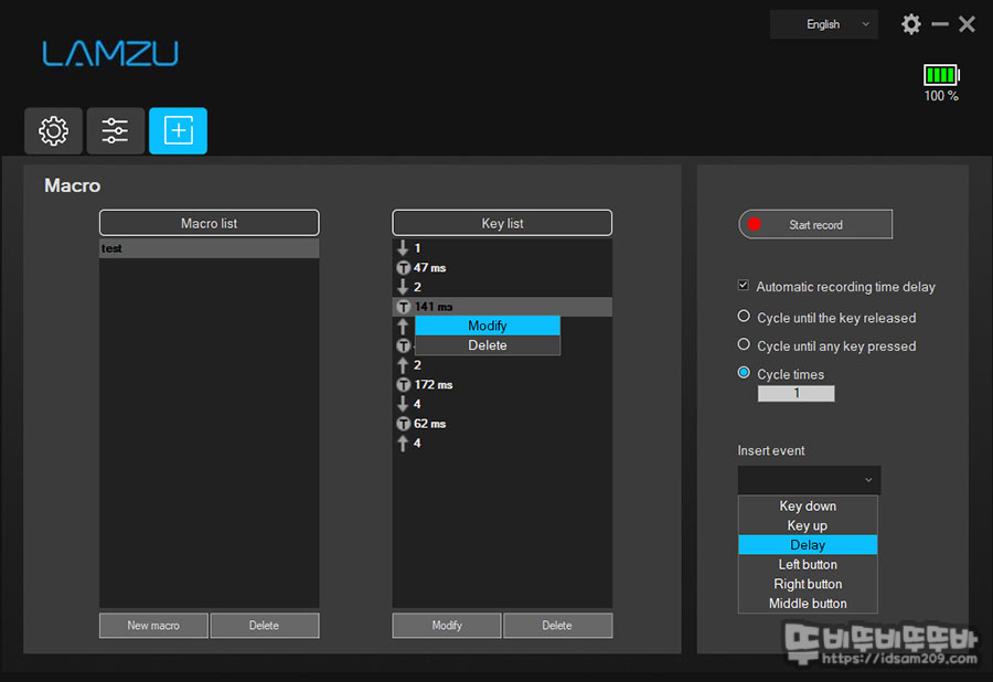 매크로 키 입력 리스트 중에서는 마우스 오른쪽 버튼을 눌러 수정 또는 삭제가 가능합니다.