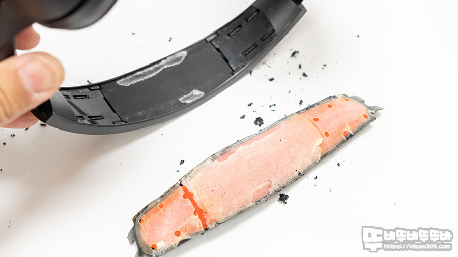 이어패드는 커버형이라 쉽게 분리가 되는 편이지만 헤어밴드의 쿠션은 전체가 양면테이프로 부착된 형태라 떼는데 상당히 애를 먹었습니다.