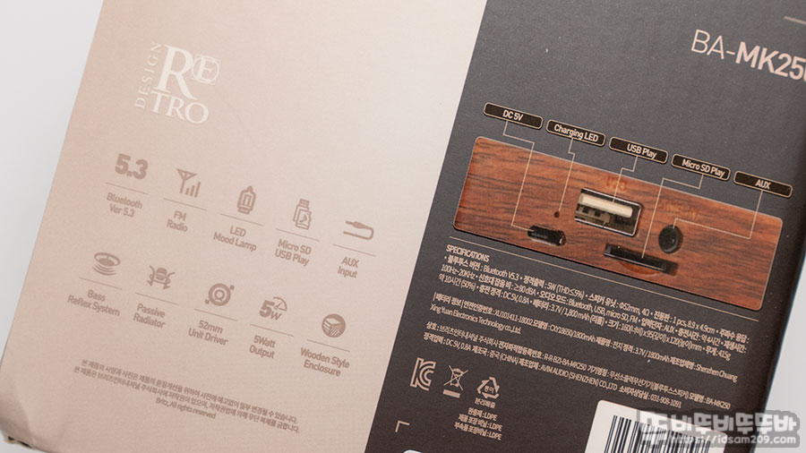 BA-MK250 패키지의 인쇄 내용에서 제품의 특징을 확 느낄 수 있는 이미지와 제품의 특징인 블루투스 / FM 라디오 / Mirco SD / USB / AUX를 지원을 표기한 내용을 확인할 수 있는데요.