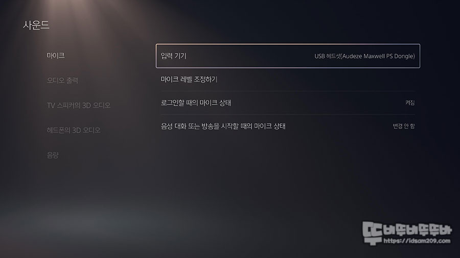 PS5 구동 후 사운드와 마이크의 입출력 기기 항목을 살펴보면 오디지 맥스웰 PS 동글로 자동으로 인식되어 별도의 선택 없이 간편하게 사용할 수 있습니다.
