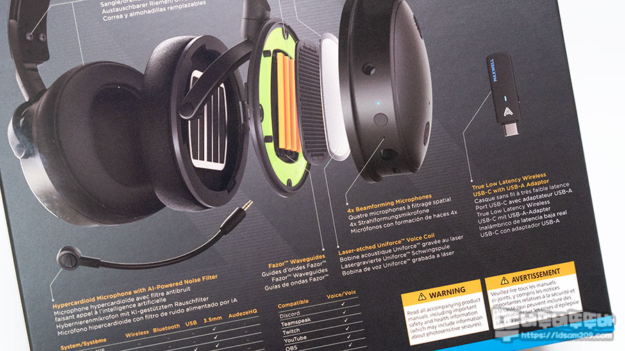 AUDEZE 오디지 무선 게이밍 헤드셋 맥스웰(MAXWELL)의 패키지에는 전체적인 실물 이미지와 제품의 특징인 90mm 평판 자력식 드라이버, 저지연 RF 2.4GHz 무선 연결, A.I 노이즈 필터, PS5 Tempest 3D Audio 지원, 80시간 사용, 블루투스 5.3, 윈도우즈/Mac OS 호환 등을 포인트로 표현하고 있습니다.
