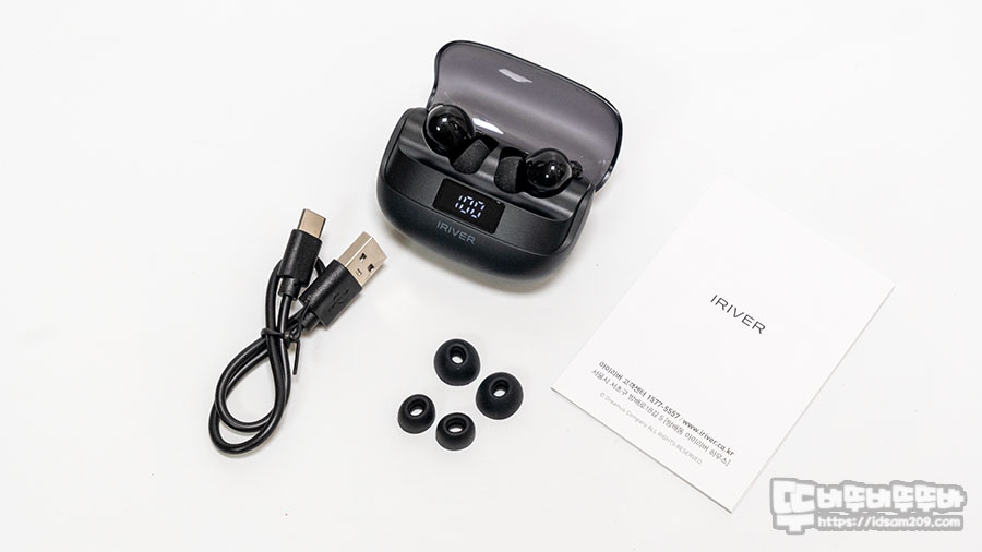 제품 구성은 아이리버 ITW-A1 충전 케이스와 무선 이어버드, USB-C to A 충전 케이블, 여분의 실리콘 이어팁, 사용 설명서로 구성되어 있고요.