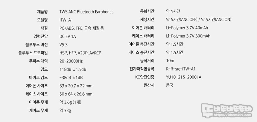 블루투스 버전 5.3, 음악재생 노이즈 캔슬링 on 시 약 5시간 Off 시 약 6시간, 배터리 용량 충전 케이스 300mAh, 무선 이어버드 40mAh, 충전 시간 무선 이어버드 약 1.5시간, 충전 케이스 약 1.5시간, 이어폰 무게 1개당 약 3.6g, 케이스 무게 약 33g으로 가벼운 것을 확인할 수 있습니다.