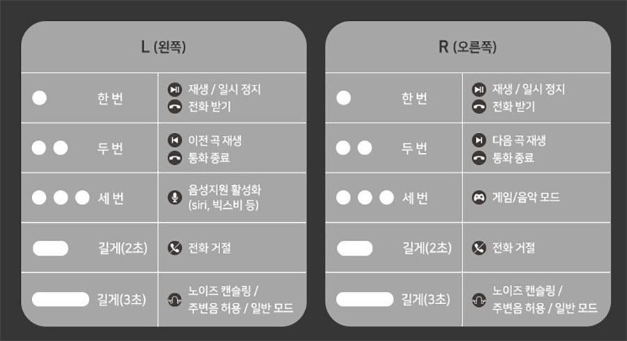 완전 무선 방식이기에 왼쪽과 오른쪽의 자유롭게 사용할 수 있는 장점이 있지만 두 번 터치하는 트랙 이동, 음성 어시스트 활성화 그리고 게임/음악 모드 선택 기능을 분리가 되어있기에 한쪽만 사용한다면 사용자가 잘 사용하는 기능이 있는 쪽을 주로 사용하시는 게 좋습니다.