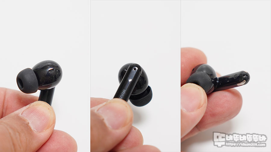 이어버드 헤드 안쪽에는 하우징 내부의 울림을 방지하는 에어밴트, 스틱 상단에는 외부 노이즈를 감지하는 마이크, 스틱 아래쪽에는 음성 통화를 위한 마이크 모습을 확인할 수 있네요.