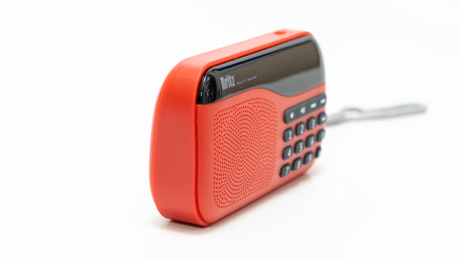 Britz 브리츠 BA-PR1 Plus FM 라디오는 한 손에 쏙 들어오는 컴펙트한 디자인으로 전면에 스피커와 조작 버튼 그리고 상태를 표시하는 디스플레이, 측면에 MicroSD 메모리 슬롯, MicroUSB 충전단자 3.5mm 이어폰 단자로 구성되었습니다.