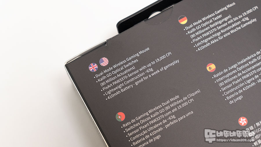 패키지 뒷면에 표현된 국가별 특징이 인쇄되어 있는데 패키지 전면의 내용과 중복되는 부분 이외에 눈에 띄는 듀얼모드는 유선과 무선 모드를 표현한 거 같고 맨 마지막에 410mAh 배터리로 약 1주일간 사용이 가능하다고 설명하고 있습니다.
