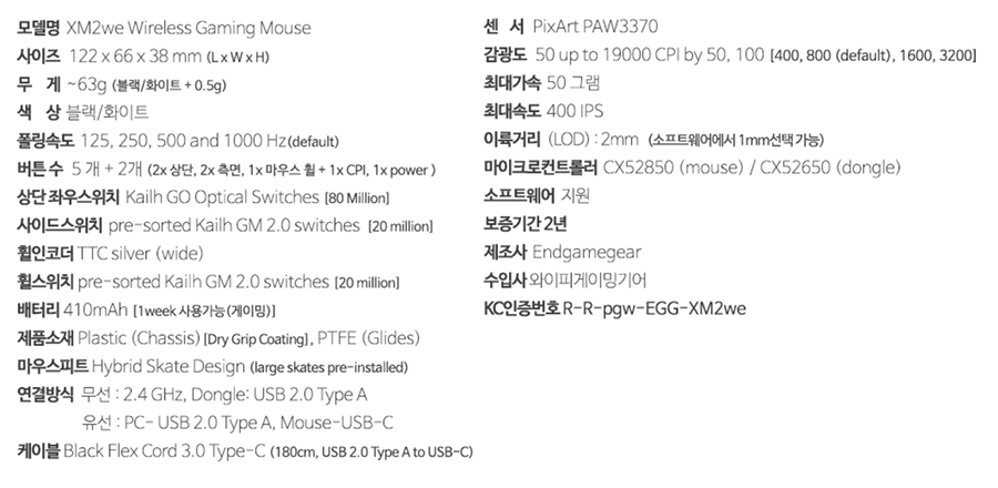 엔드게임 XM2we 무선 게이밍 마우스는 XM1와 XM1R 외형과 그립감을 그래도 픽셀아트 3370 센서와 배터리를 내장했음에도 유선 모델보다 가벼워진 63g 무게, 메인스위치를 8천만 회 클릭 수명을 지원하는 KAILH GO 광 스위치가 적용된 제품으로 이전의 유선 모델의 만족감을 무선으로 느낄 수 있는 제품인데요.