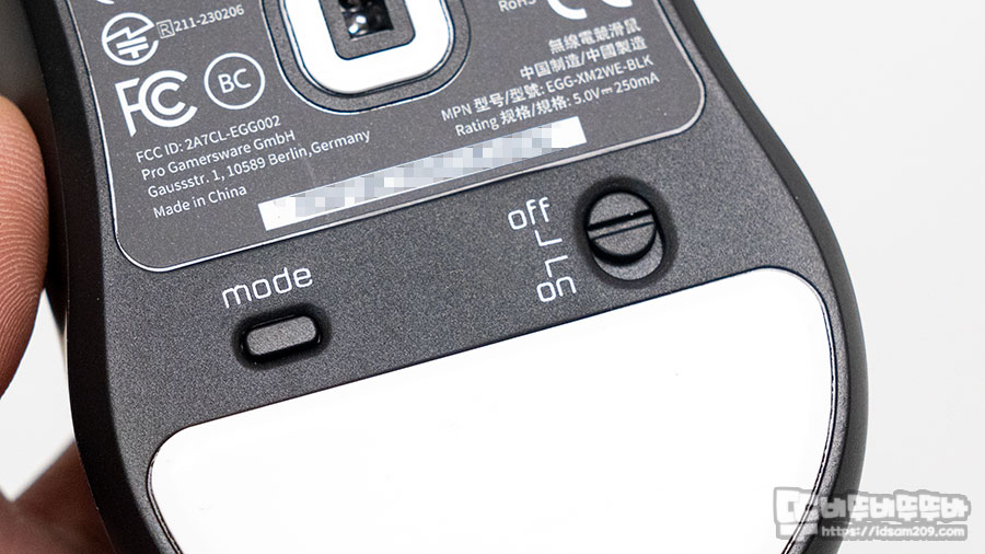 바닥면에 전원 On/Off 버튼과 DPI 변경을 담당하는 Mode 버튼으로 구성되어 있으며 RGB 효과는 없지만 마우스 측면 바닥면에 DPI LED 인디케이터 모습을 확인할 수 있고요.