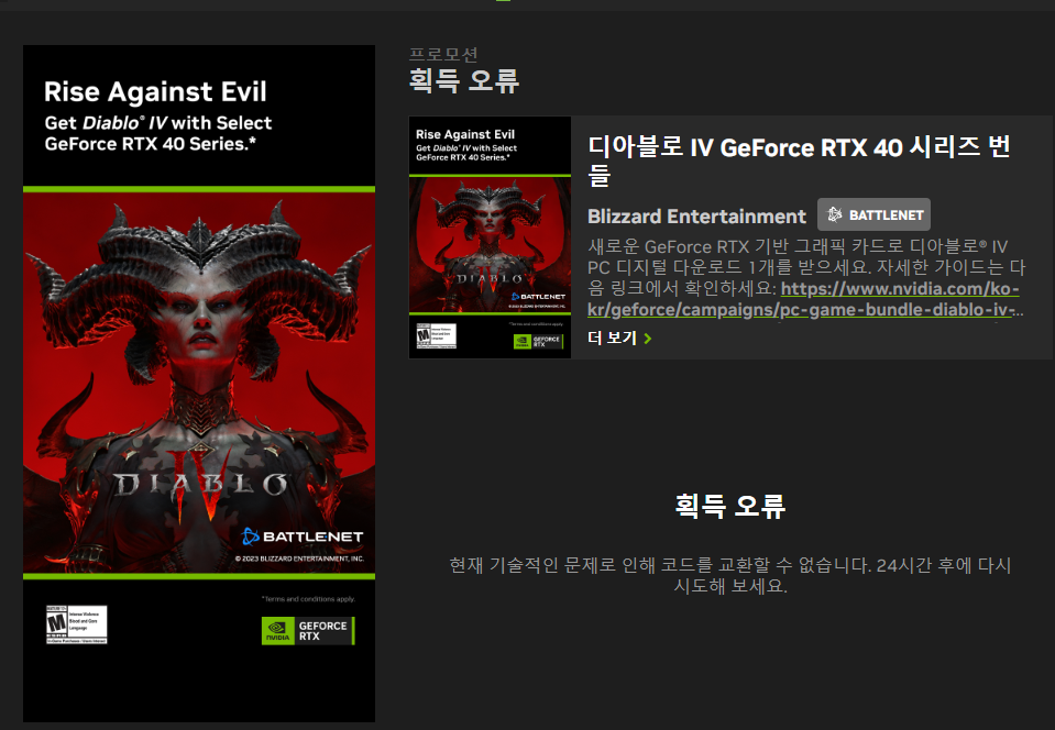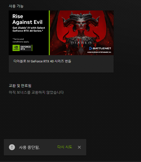 ZOTAC RTX 4070 그래픽 카드를 구입하고 제공받은 쿠폰 교환 코드를 이용하여 디아블로 4 다운로드를 하기 위해 이벤트 페이지에서 알려준 NVIDIA GeForce Experience 로그인 → ID를 클릭해서 나오는 사용 클릭 → 리딤 코드 입력 → 블리자드 베틀넷 로그인 → 교환버튼 클릭 순으로 진행하였는데.....