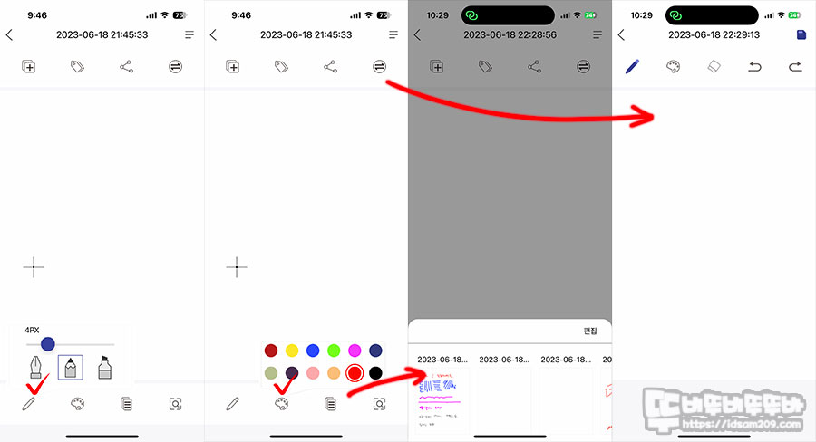 그 밖에 앱 화면 아이콘을 선택하여 펜 타입, 컬러를 선택하여 다양한 작업이 가능하며 디지털로 생성되는 노트의 내용을 날짜별로 확인이 가능하고 앱 상단 우측의 아날로그 ↔ 디지털 전환 아이콘으로 선택하면 펜으로 입력하는 아날로그 입력 내용과 스마트폰 화면에서 터치로 작업하는 내용을 병행하여 작업이 가능한데요.