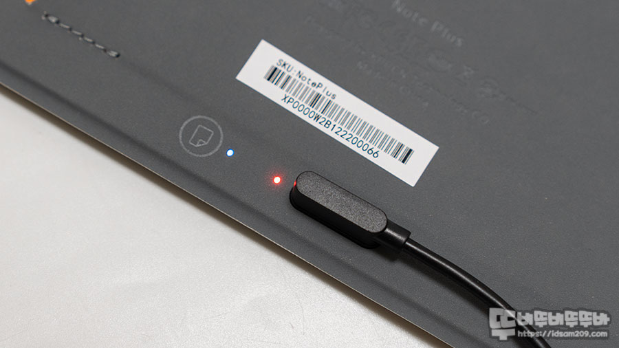 스마트 노트 패드는 마그네틱 USB 충전케이블을 사용하고 있어 편리하게 사용할 수 있으며 마그네틱 커넥터 옆에는 충전 상태를 알려주는 LED 인디케이터와 동기호 버튼으로 구성되어 있는데요.