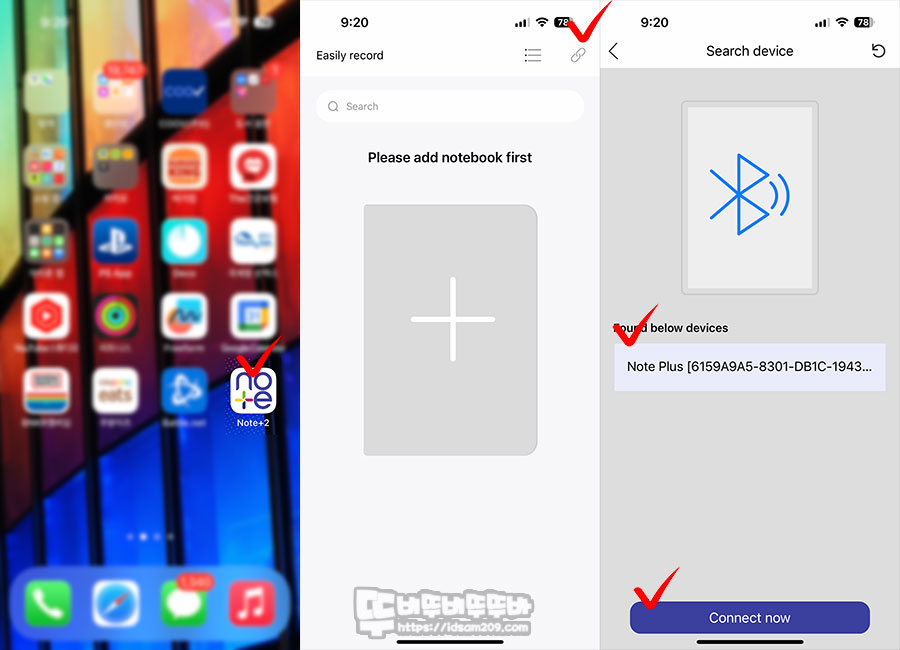 앱 우측 상단에 링크 아이콘을 선택 후 블루투스 기기로 표현되는 Note Plus를 선택 후 아래 "Connect now" 선택하면 스마튼 노트 패드의 동기화 버튼을 누르라는 메시지가 나오며 동기화 버튼을 누르면 LED 인디케이터가 블루에서 그린으로 변경되며 동기화가 됩니다.