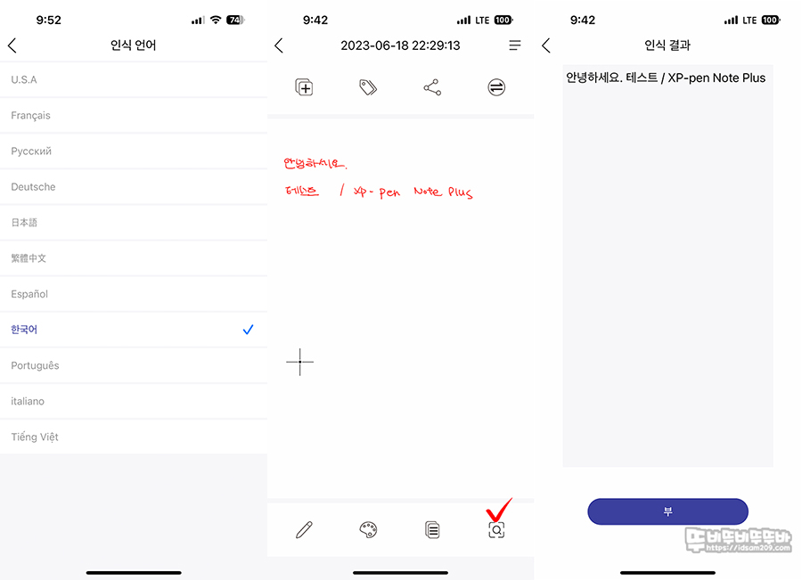 특히 다양한 언어 인식이 가능하지만 아날로그로 입력된 필기를 앱 우측 하단 버튼을 눌러 디지털 텍스트 전환이 가능한데요.