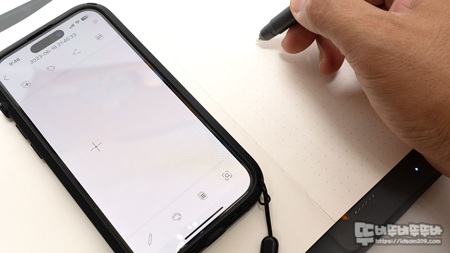 특히 A5 사이즈의 노트에서 필기 또는 그림을 그리는 경우 스마트폰의 작은 화면에 표현되는 만큼 중요한 필기 작업의 경우 스마트폰 앱 화면은 확대하여 사용하시면 사용하시기 바랍니다.